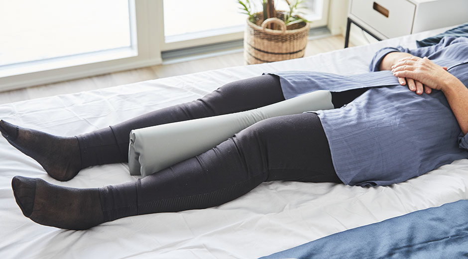 By combining the cushions LEJRELET Pad High and Wedge, you can create a stable side-lying position with plenty of room for performing intimate hygiene on clients who are unable to do so themselves. Place one leg on top of Pad High and place Wedge in front of the chest for the client to lean into for a slightly forward-tilting lateral position. With this position, the upper body falls comfortably forwards into the Wedge while the leg is lifted so that the hip joint becomes loose. This position is both comfortable and makes sure that the healthcare staff has easy accessibility and visibility when performing intimate hygiene. If the client has long lower legs, a Pad Low can be rolled up and positioned below the foot to ensure that the foot doesn't dangle.